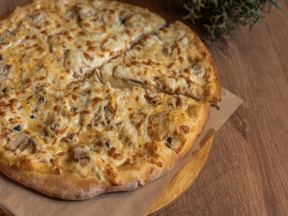 Сливочный соус, буженина, лук, шампиньоны, моцарелла